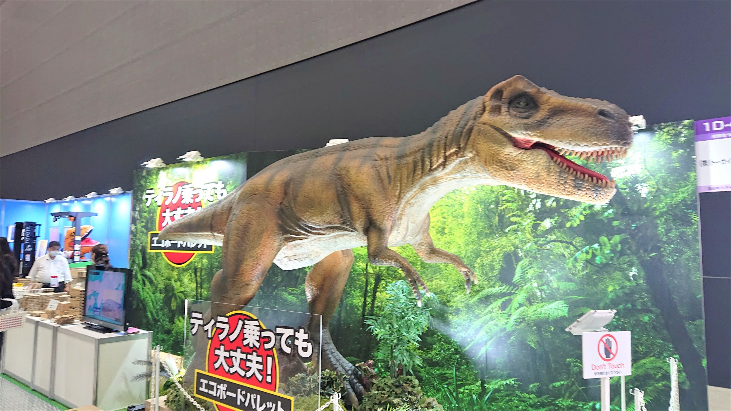 恐竜のモニュメントの展示かと思ったら、足下の段ボールパレットの紹介でした。