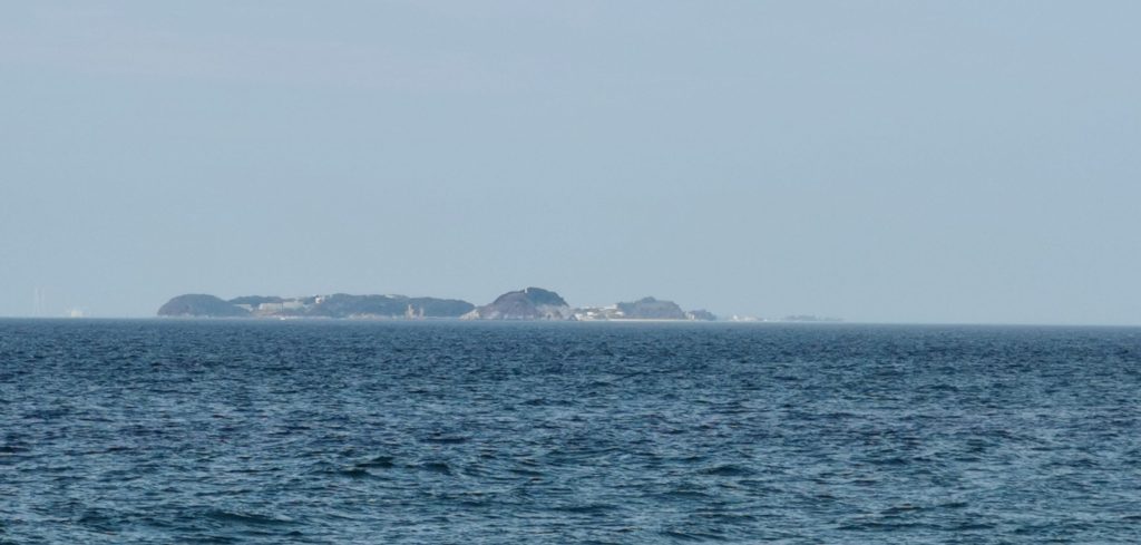 三河湾の方を見ると、篠島が見えます。たぶん重なって向こうに見えるのが、日間賀島と佐久島ですね。この位置から見ると3つの島が重なって見えます。