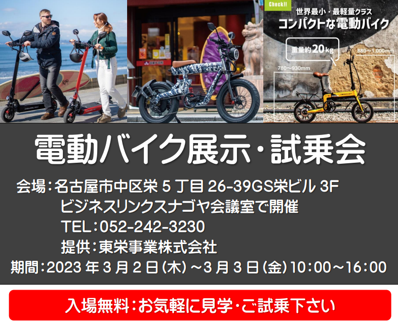 名古屋のレンタルオフィス、バーチャルオフィスを提供している「ビジネスリンクス・ナゴヤ」の室長・新井です。今回、話題の電動バイク展示・試乗会を開催します。このイベントでは、原付1種(50ccバイクに分類されます)の電動アシスト自転車・バイクを展示します。このタイプのバイクには、原付免許やナンバープレートが必要です。しかし、今年7月に法改正が行われましたため、速度が20キロ以下の場合は免許やナンバープレートが不要なタイプもあります。まずは気軽に試乗してみてください。