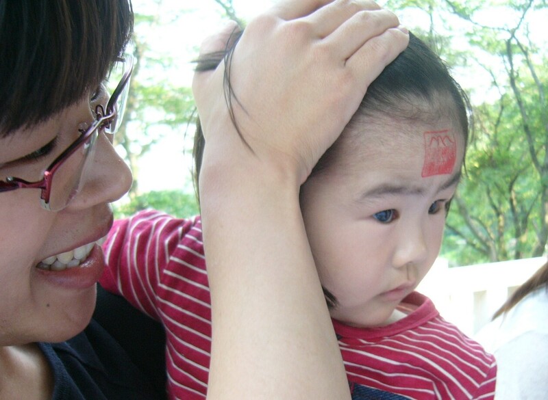 男の子は「さくらの花びらの中に浅間神社」、女の子は「角印(2㎝角)の中に浅間神社」の御朱印を押します。おとなしく御朱印を押される子もいれば、驚いて泣き出してしまう子もいます。