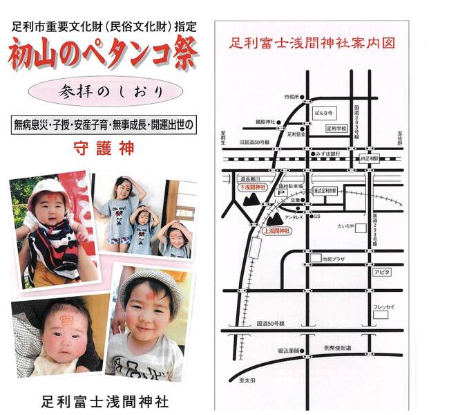 男浅間(上の宮)と女浅間(下の宮)で毎年山開きの6月1日に行われます。このお祭りは400年以上も前から始められたといわれ、足利市の重要文化財に指定されています。その昔、足利地方に起こった洪水・疫病・飢饉で多くの子供が苦しんだ時、この神社が祀られている山から龍がのぼり子供たちが救われたことから始まったという伝説があります。祭りの当日、この1年の間に生まれた赤ちゃんを連れて参拝し、御朱印(男女で形が異なります)を額に押してもらい、無病・息災・開運を祈願します。男の子は高い山の男浅間に、女の子は低い山の女浅間へ参拝します。神前で赤ちゃんの額に神社の御朱印を押すことから「ペタンコまつり」の名で親しまれています。