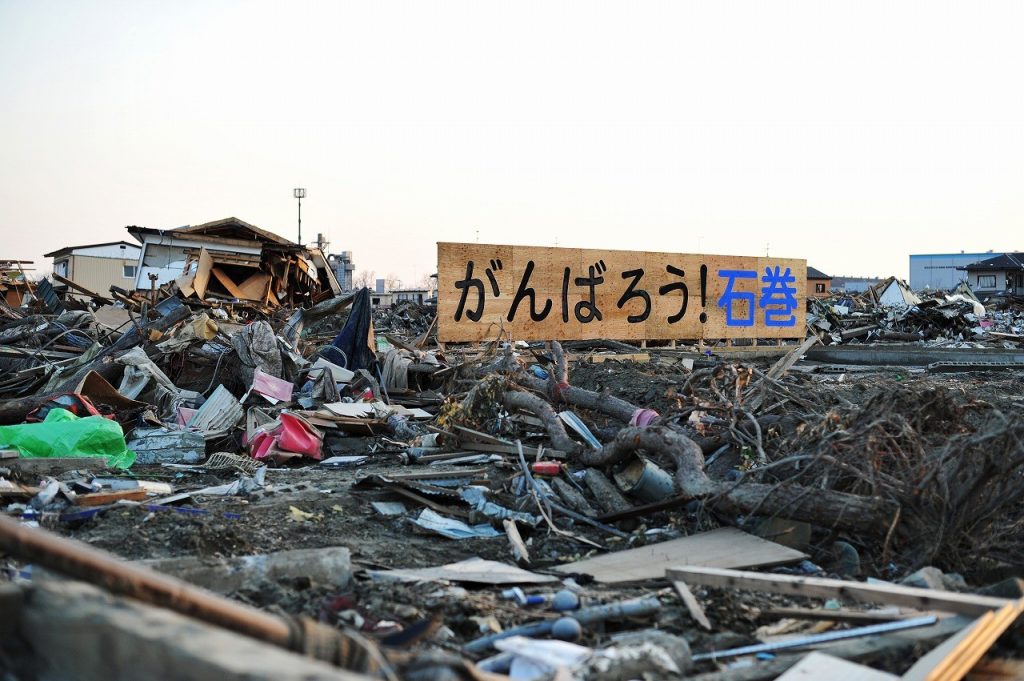 今年で震災から12年が経ちました。この公園は震災前は普通に街があり、住民の生活が営まれていた場所でした。しかし現在は、まだまだ復興が完了していないため、新しい公園や空き地が多く見受けられます。公園の中にも、災害の痕跡があちこちに残されており、津波で流された家屋の土台もそのまま残されています。また、「がんばれ!石巻」というメッセージの看板もこの公園内にあります。この看板は震災直後に作られ、今もなおその場所に残っています。