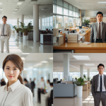 Japanese standing in a bright clean office. angle=wide-angle --ar 16:9