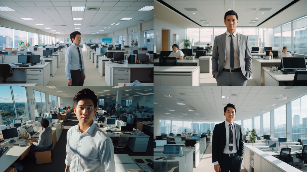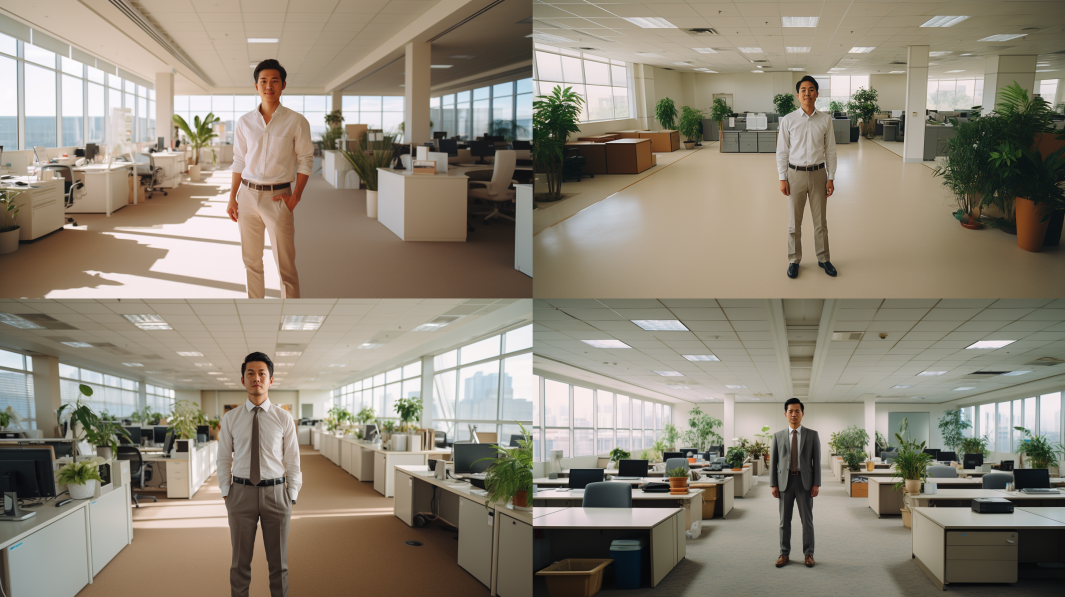Japanese standing in a bright clean office. angle=ultra-wide-angle --ar 16:9
