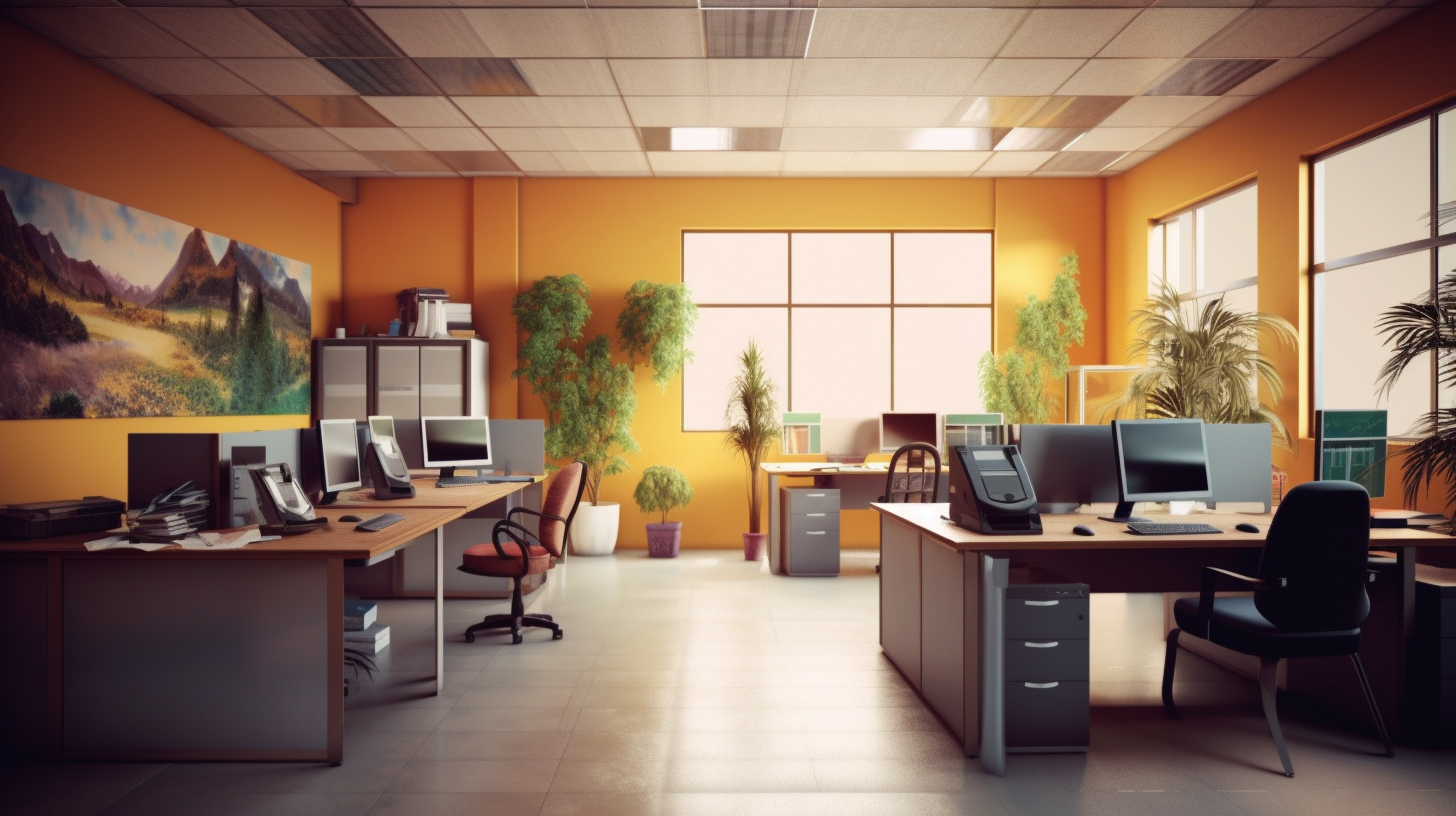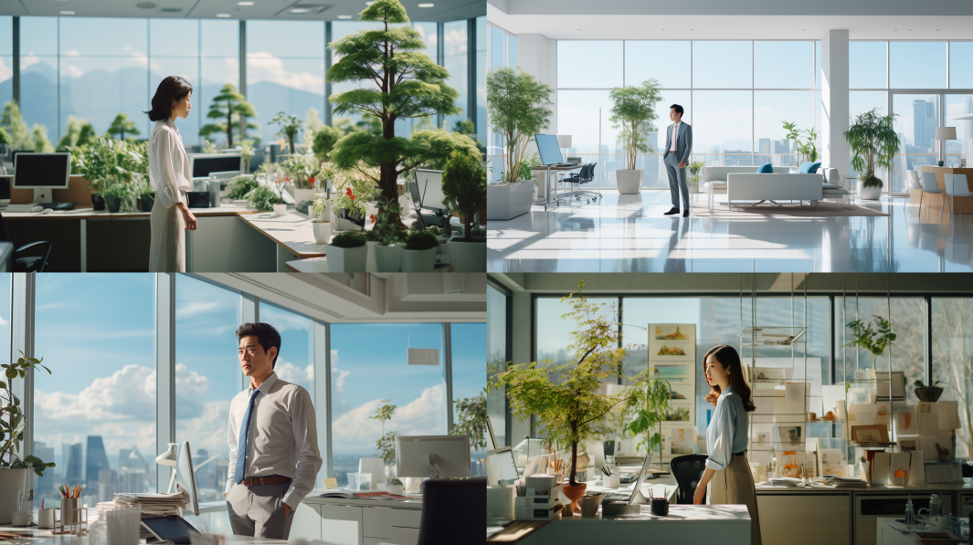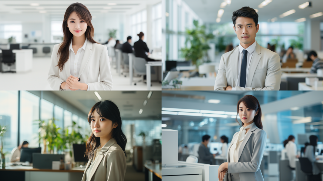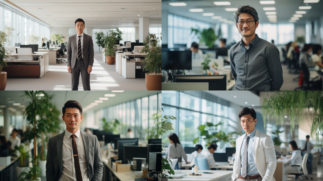 Japanese standing in a bright clean office. angle=telephoto-lens --ar 16:9
