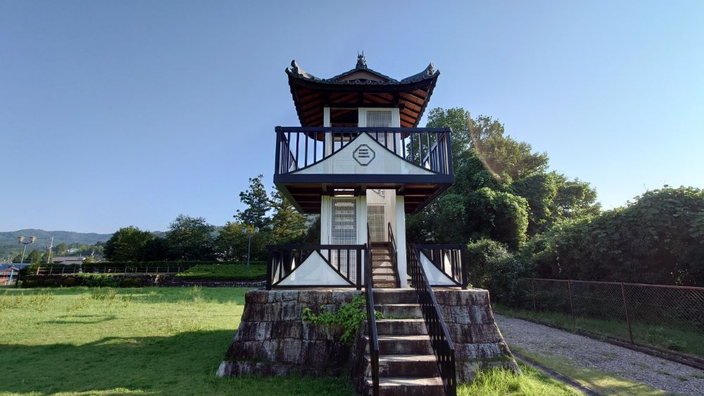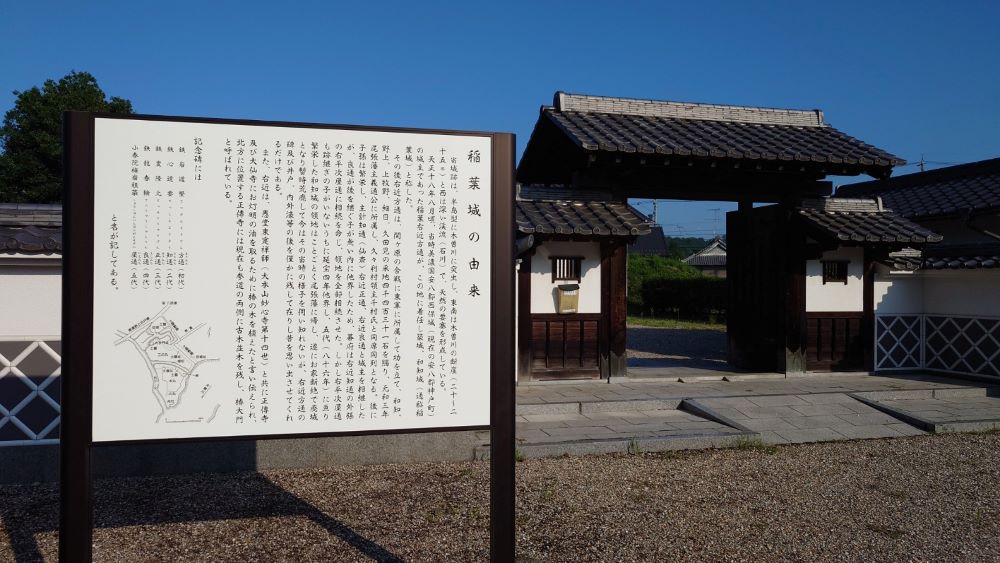 和知城は、戦国時代の武将で美濃三人衆と称された稲葉良通(一鉄)の子で、豊臣秀吉に使えた稲葉方通によって1590年頃に築かれた。現存するのは空堀、井戸、曲輪、土塁のみ。ただし、本丸と二の丸を隔てる空堀は巨大で、城址の見どころともいえる。和知城は築城主の名より稲葉城とも呼ばれ、現在城址周辺は稲葉城公園として整備。復元された薬医門を通って入る公園内には城址碑のほか、櫓もしくは天守を模したと思われる稲葉家家紋付き展望台もあり、眼下に木曽川が望める。