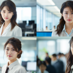 Japanese standing in a bright clean office. composition=Facial-close-up, --ar 16:9