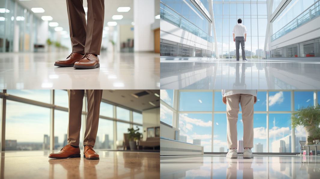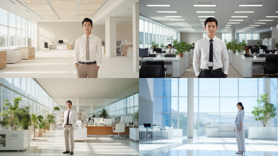 Japanese standing in a bright clean office. composition=Foot-close-up, --ar 16:9