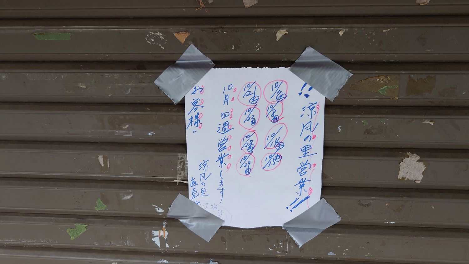 今回は、涼風の里へよりましたが、残念な事にお休みです。実は、ココに寄るのは今回で5回目くらいです。寄るたび毎回お休みなんです。実際には、閉店してるんじゃないか疑ってるんですが、シャッターの張り紙を観ると営業はしてるみたいです。営業日時を見ると、僕が寄った祭日のみ営業日に入っていないので、単純に運が悪いだけかもです(T^T)次回は絶対営業してますように(^∧^)