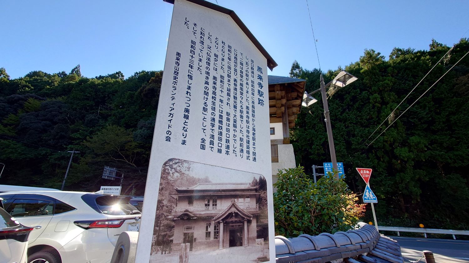 今回、鳳来寺山の表参道に立ち寄りました。ここでは多くの人々が車を駐車して散歩を楽しんでいます。この場所はかつて鳳来寺駅の跡地だと言われていますが、駅の面影はほとんど残っていません。周辺には、休憩できるカフェや旅館、歴史博物館などが点在しており、散歩コースとしておすすめです。