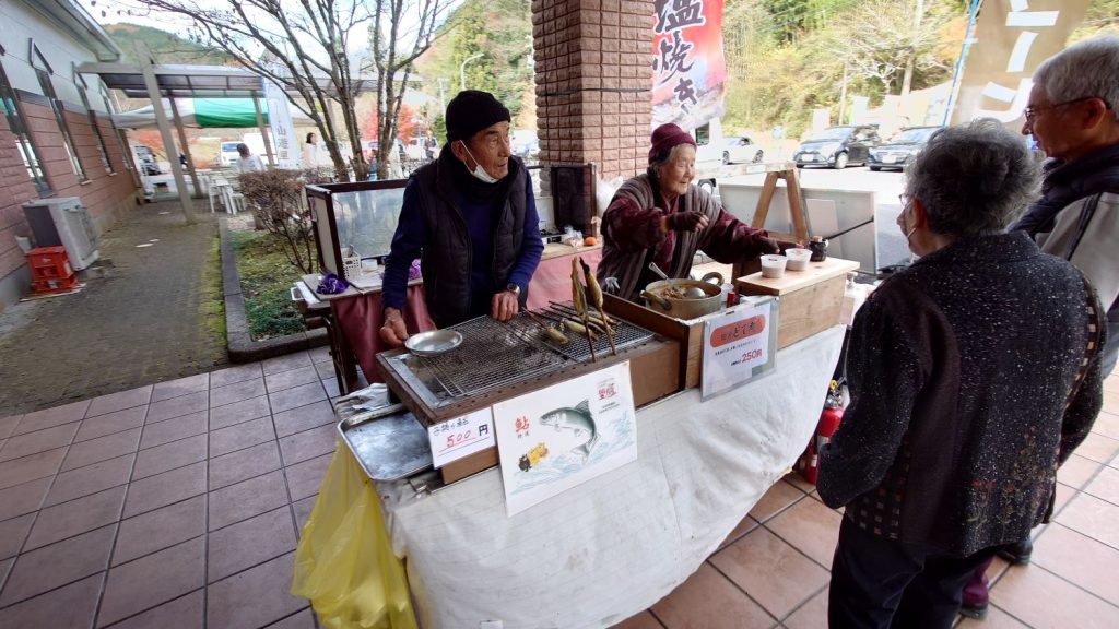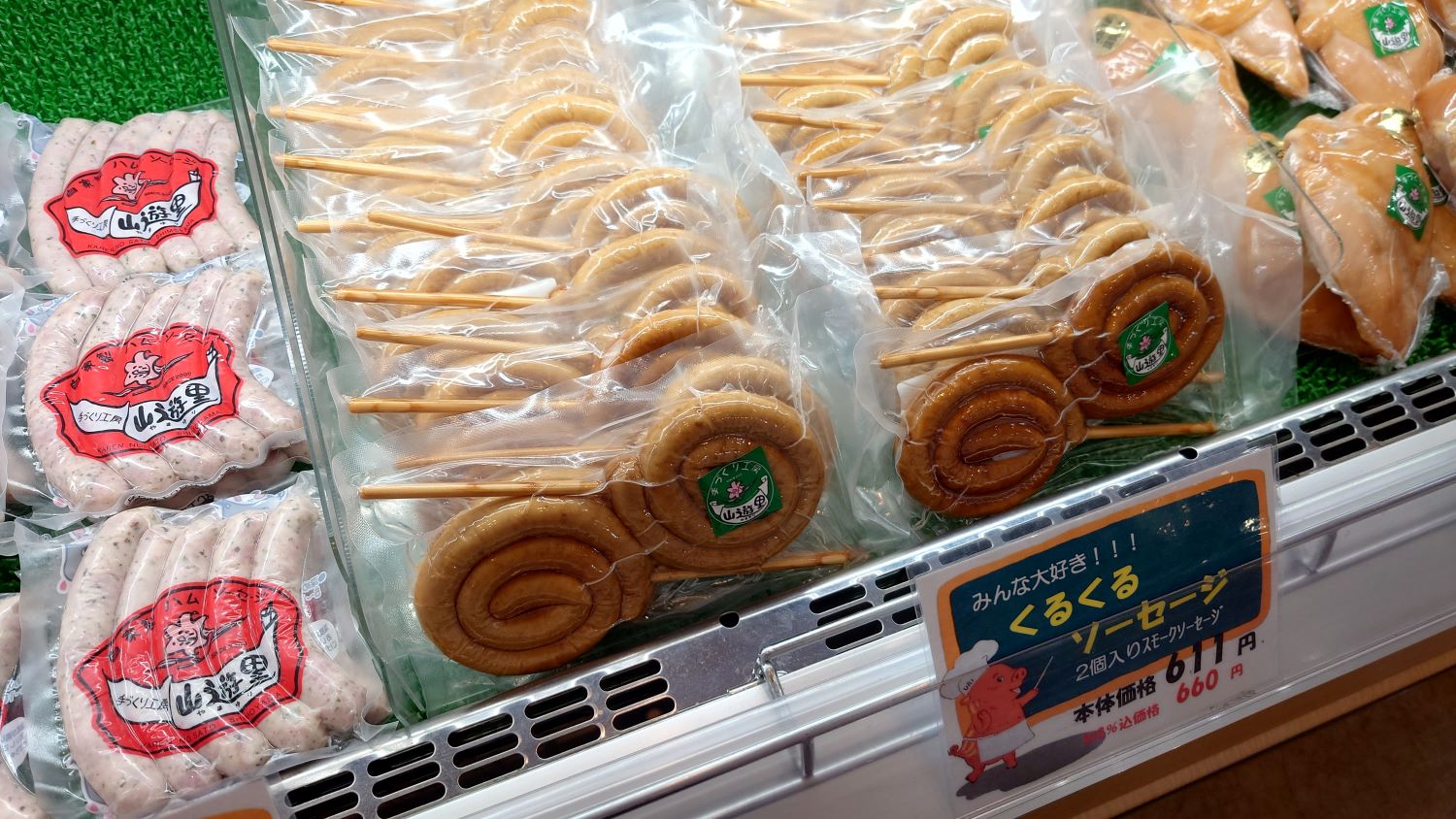 「山遊里」の手作りソーセージが、入口でおじさん達が焼いて販売していました!おでんや焼き魚なんかも販売して美味しそうでした!今回は、ランチした後なので、次回食べるとします。お店の中では、くるくるソーセージも販売していて、お持ち帰りもできます。