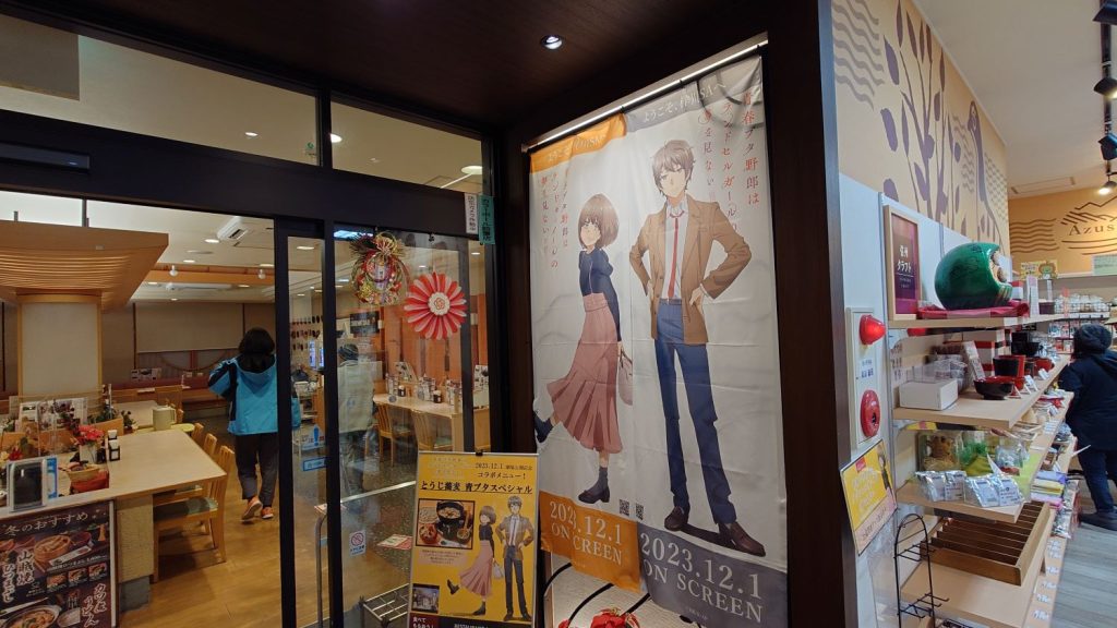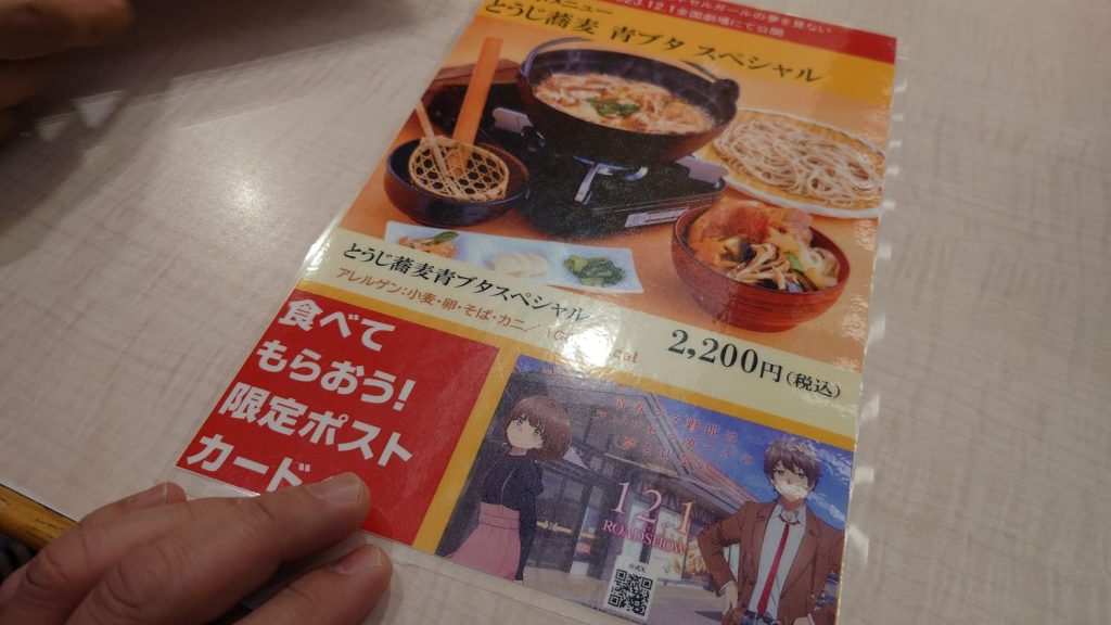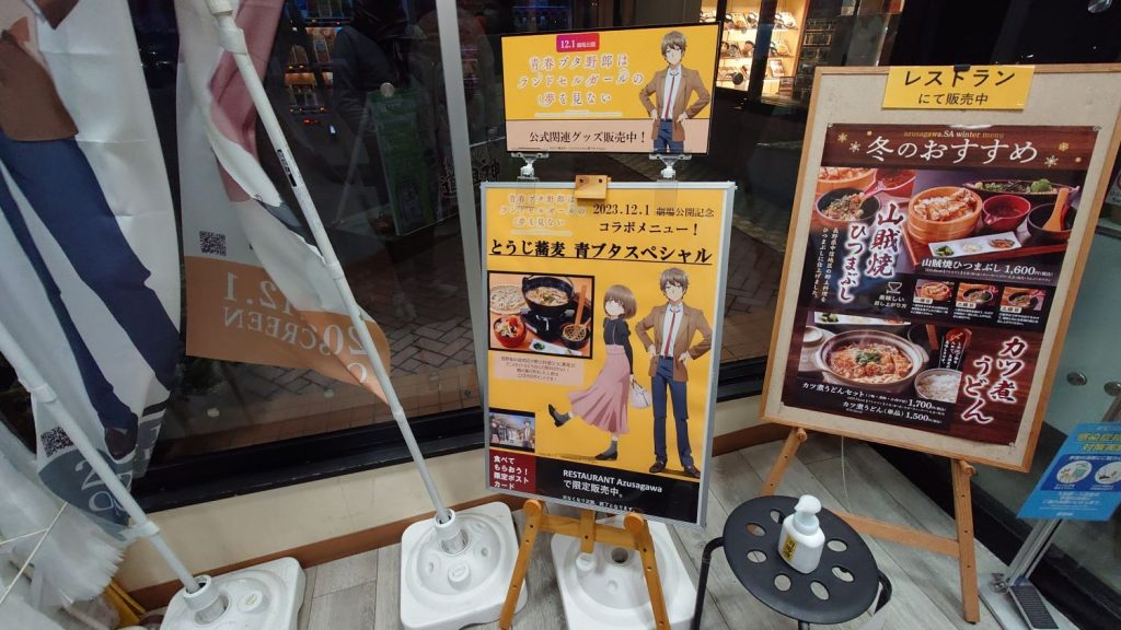 白馬からの帰り道、長野自動車道に乗って名古屋へ帰ります。せっかくなので、途中の「梓川サービスエリア」でご飯休憩です。このサービスエリアは、アニメ「青春ブタ野郎はバニーガール先輩の夢を見ない」の主人公「梓川 咲太」の名字と同じ名前のサービスエリアです。物語の中には、このサービスエリアは出てきませんが、主人公が自己紹介する際、このサービスエリアの名前が出てきます。早速寄ってみましたが、案の定、アニメを紹介する案内やポスターが沢山貼られていました(^^)。レストランで食事をしようと、メニューを見たら、青春ブタスペシャルメニューがありました。ちょっと値段が高いな~(^^;)、と思いましたが、地元の名物「山賊焼定食」を注文しました。サービスエリアのレストランにしては、なかなか美味しいです。
