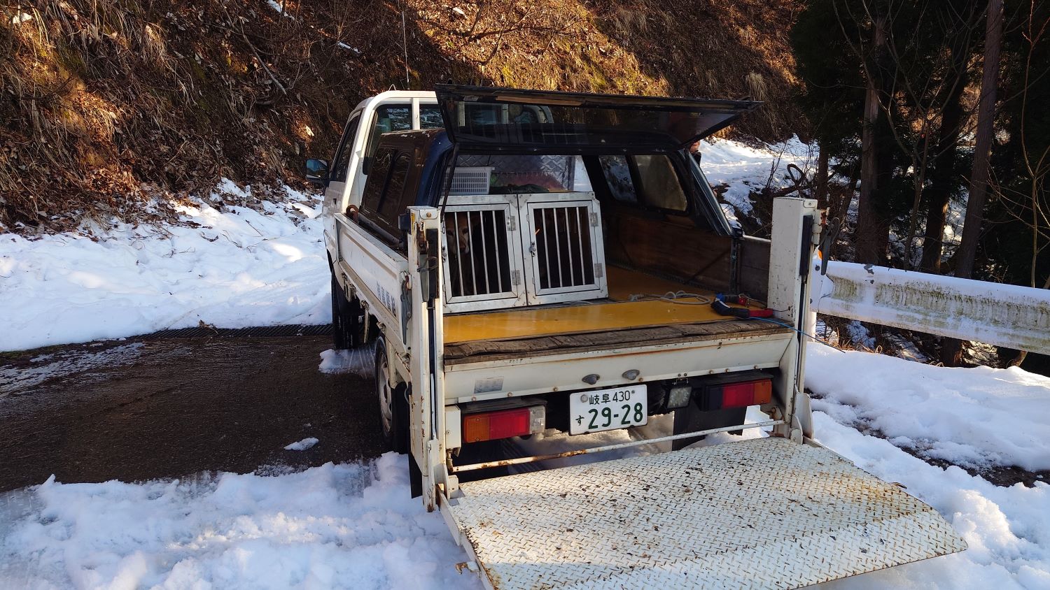 今回、徳山ダム付近の山の中を走行中に、地元の猟友会の方々と出会いました。雪の中を自家用車のカローラで走行していると、突然猟友会の皆さんに出会いました。皆さんが一斉に私の方を向いて、「こんな雪の中にまでどこへ行くつもりですか?」と尋ねてきました。私は、「この先の景色を写真に撮りたくてきました!」と答えました。すると、「そっかー、気をつけてね」と激励されました(o^ ^o) しかし、猟友会の皆さんはすごいですね!スノーモービルで雪山に入ってくるんですね。ライフル銃を持っている姿を見ると、少し怖かったです。トラックの荷台には猟犬が乗っていました。その犬はずっと私の顔を見つめていました。皆さんも安全に気をつけてくださいね(o^ ^o) /