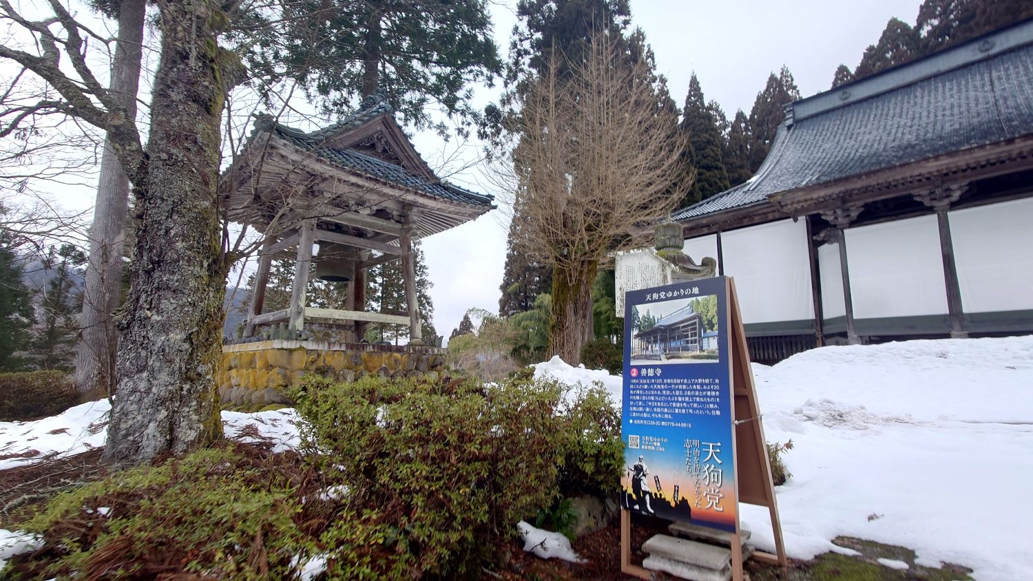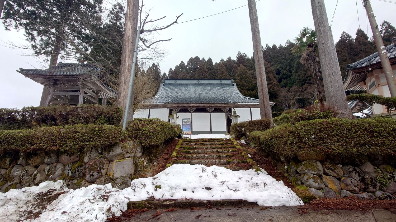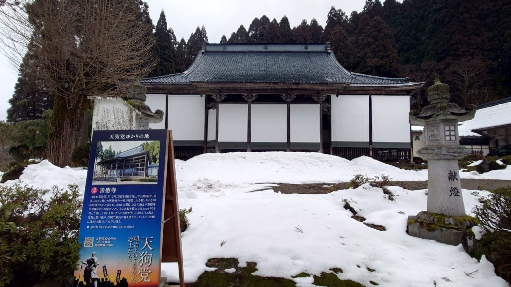 今回は、福井県今立郡池田町にある善徳寺を訪れました。この寺は堀口家住宅のすぐ近くに位置しています。善徳寺は、水戸天狗党が京都へ向かう途中に宿泊した場所として知られています。歴史については詳しくありませんが、この場所が歴史的に重要な意味を持っていることは想像できますね(^_^) 私が訪れたのは真冬でしたので、本堂には雪を防ぐための防護幕がされており、内部を見ることはできませんでしたが、夏場には内部の詳細な構造まで見ることができるようです。賑やかな名所ではありませんが、散歩やドライブの途中で立ち寄るのも良いでしょう。