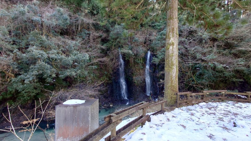 岐阜県揖斐郡の山奥に位置する夫婦滝は、二つの滝が並んで流れることからその名がつけられています。あまり有名な観光地ではありませんが、季節を問わず楽しむことができる場所です。特に雪が積もった時には、その美しさが際立ちます。私が訪れた時も雪が残っていましたが、やや残雪が少なかったですね(^_^)夜はライトアップされており、美しい滝を鑑賞することができます。ただし、時々電球が切れていることがあるようですので、訪れる際には注意が必要です。ネット上でもそのような情報が書かれています。