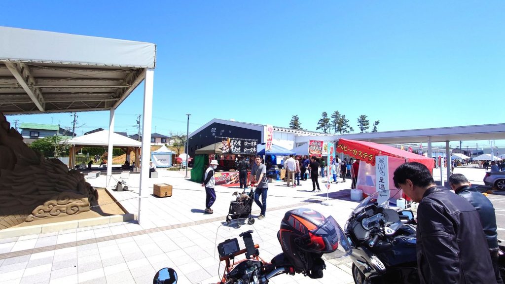 石川県の千里浜なぎさドライブウェイを走った後、道の駅「千里浜」で休憩しました。人と車でいっぱいで、新しくできたばかりのため大人気のようです。駐車場は満車の看板が出ていましたが、バイクはスペースが確保されており、問題なく停めることができました(^_^)。