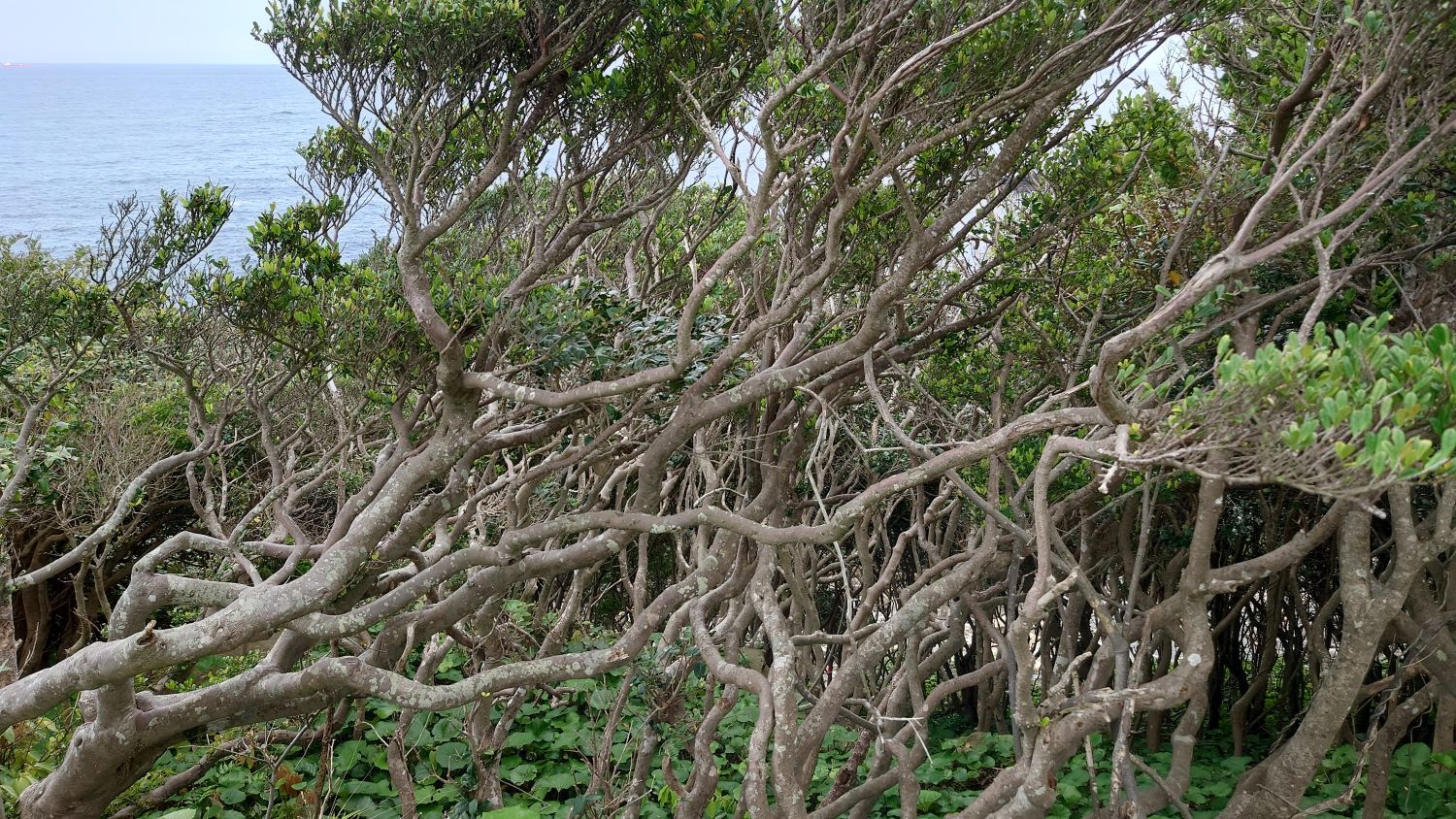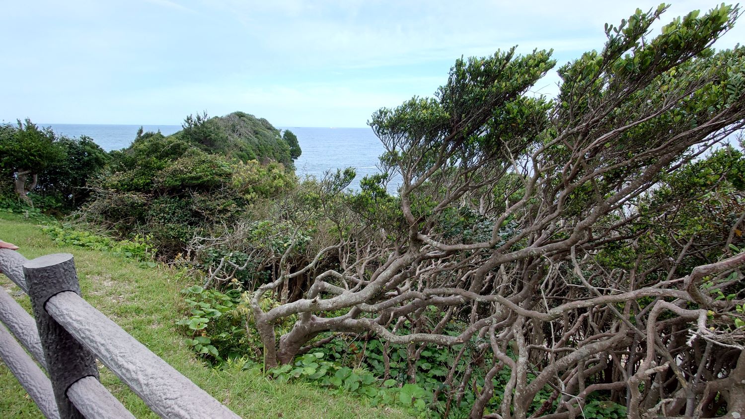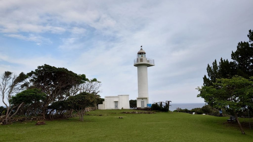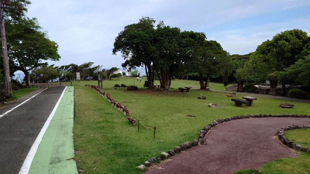 公園内にはいろいろな施設がありますが、まずは灯台を紹介します。この灯台はそれほど有名ではありませんが、1963年に改修されて以来、約50年間にわたり海の安全を守ってきました。ちなみに、ここは紀伊半島の先端に近いため、台風の通り道でもあります。そのため、周りの木々は強風の影響で傾いています。