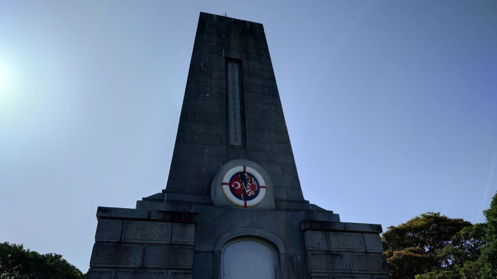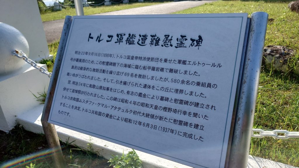 今回は、和歌山県東牟婁郡串本町の紀伊大島に位置するトルコ記念館を過ぎると次は、トルコ軍船遭難慰霊碑がそびえ立ちます。近づいてみると思いの外大きな慰霊碑です。余談ですが、こんなデカイ慰霊碑は始めて見ます。今まで見てきた慰霊碑は、これと比べると10分/1くらいです。とにかくデカイです。案内板を読むと、580人のトルコ人が亡くなり、助かったのはわずか69人だそうです。ご冥福をお祈りします。