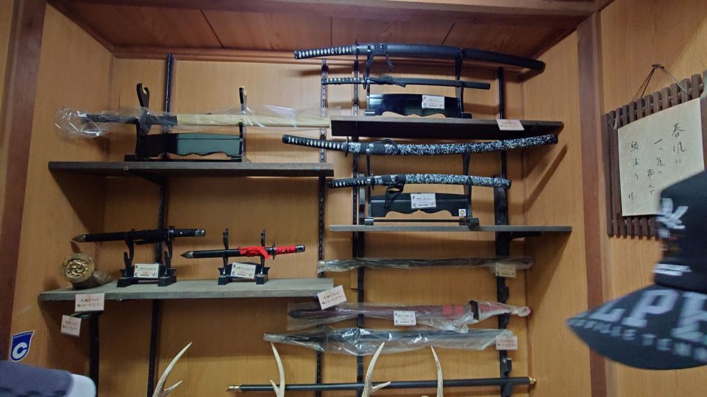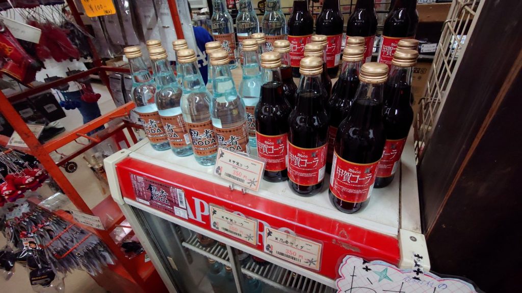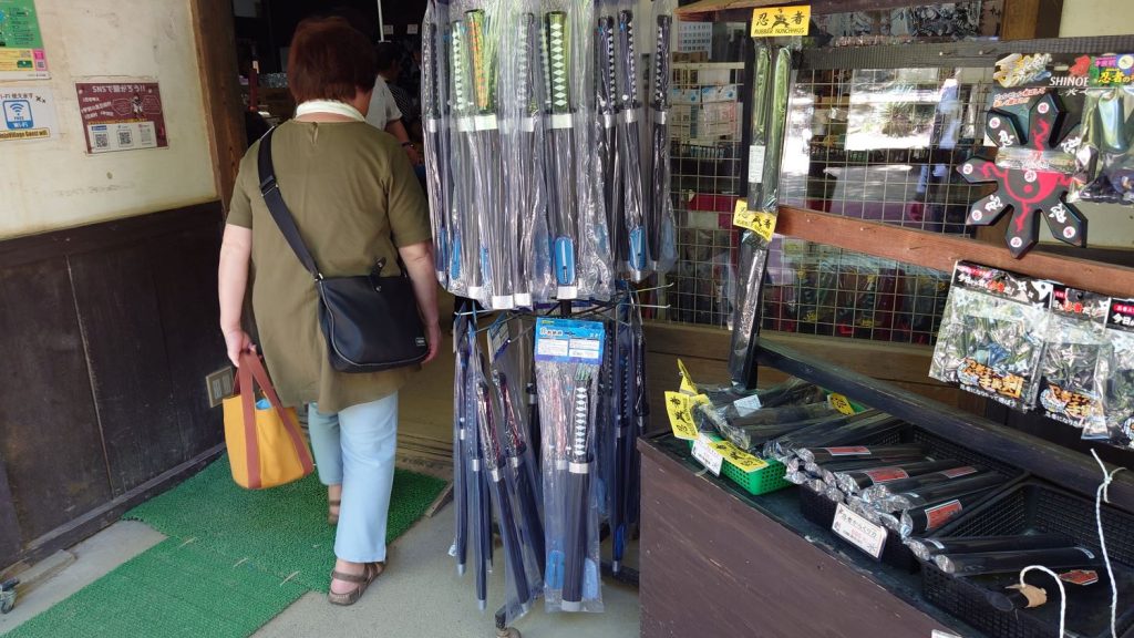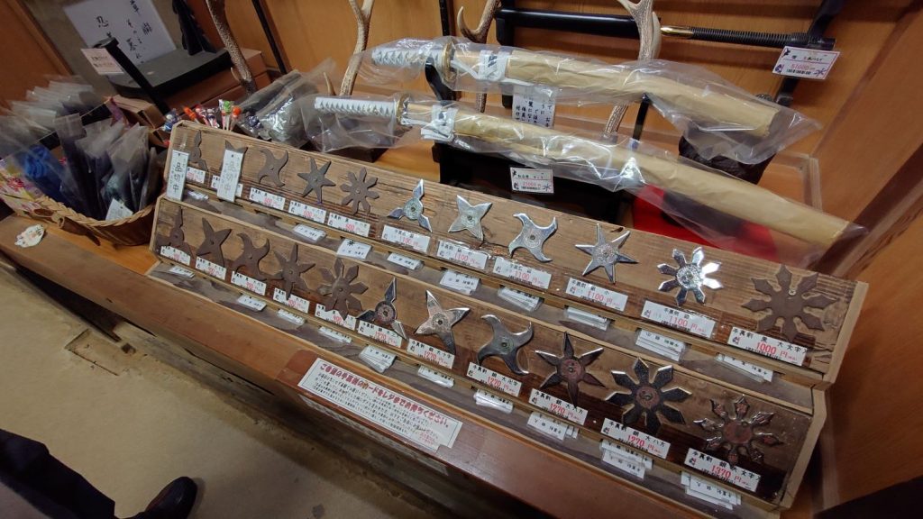忍者村のお土産ショップに入ってみると、驚きの商品がたくさんありました。特に驚いたのは、刀や手裏剣が販売されていたことです!しかも、それらは金属製で、下手をすると刺さりそうなほどです。昔はこういったものが当たり前に売られていましたが、今の時代では珍しいお土産ですよね。他にも色々と見ていると、甲賀コーラや忍者サイダー、忍者煎餅など、面白い商品がたくさん並んでいました(^_^)。小学生の男の子なら、ワクワクするようなものばかりです。