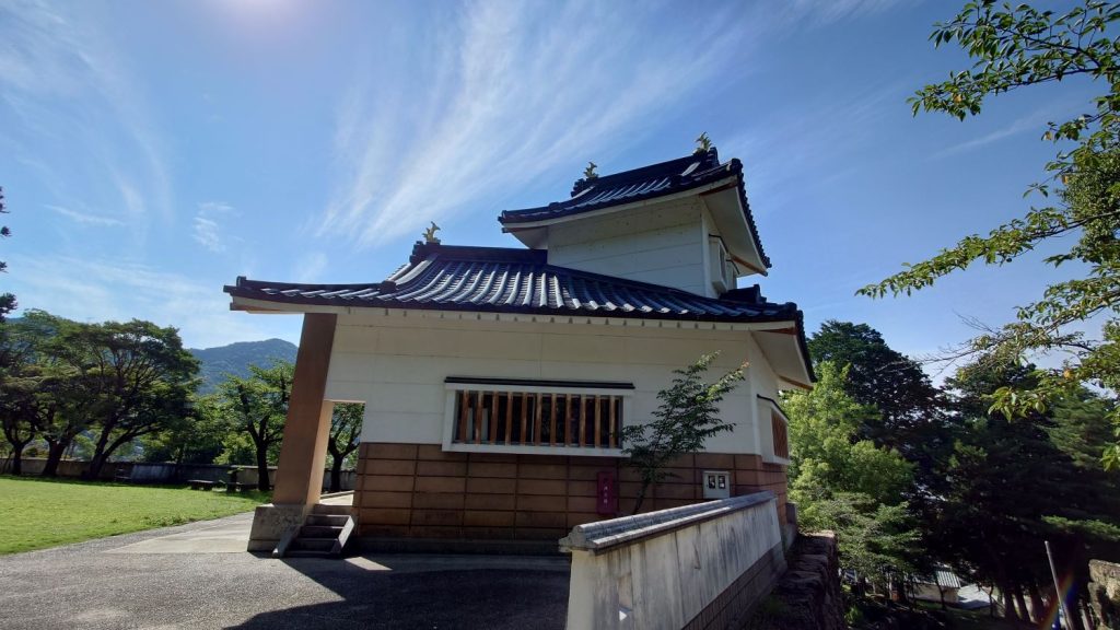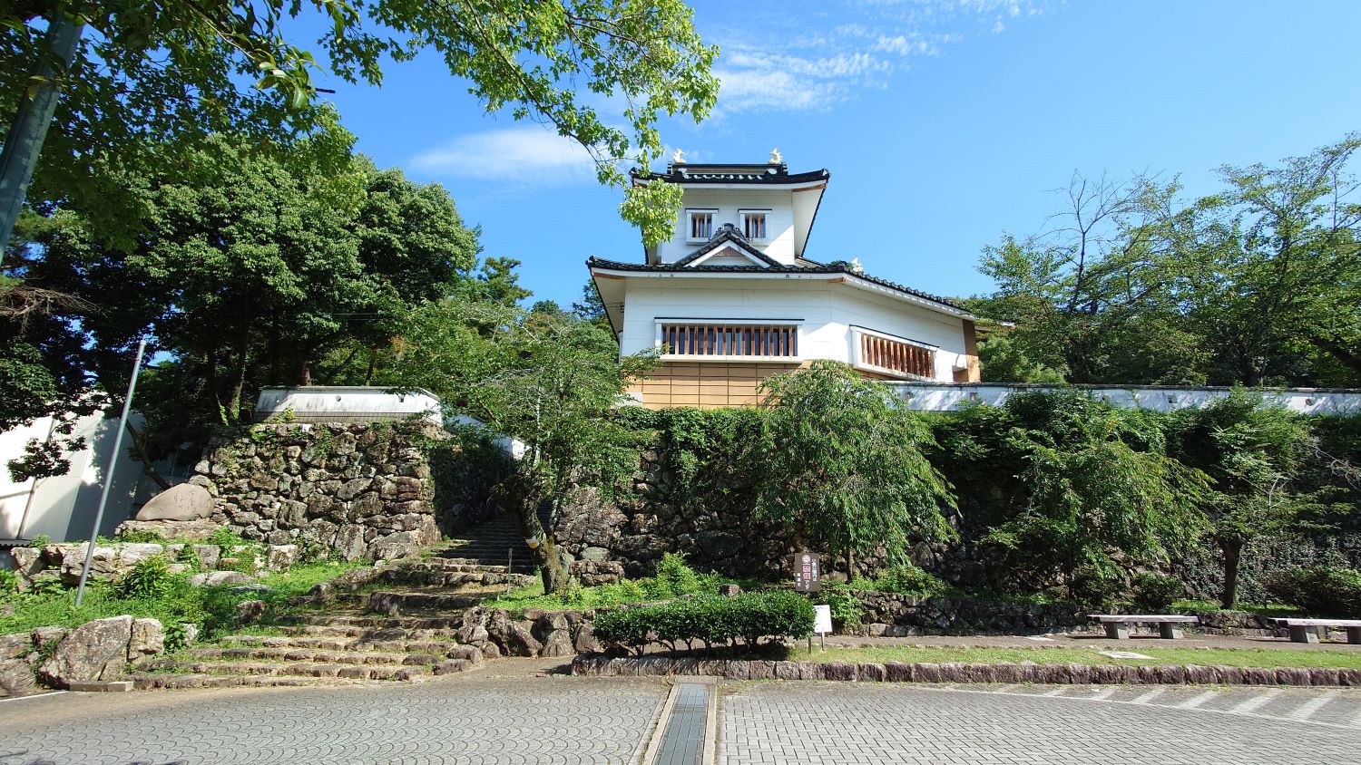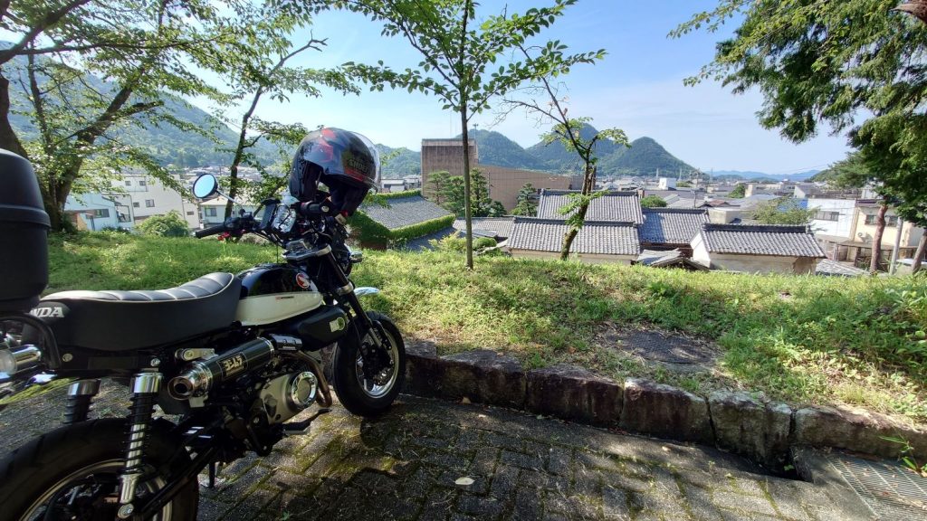 特に良かったのは、この城跡公園の駐車場からの眺めが最高だったことです。「うだつの上がる町並み」と周囲の山々の美しい景色を一望でき、思わずバイクと一緒に写真を撮ってしまいました。お城の裏手には長良川が流れており、訪れていた人々が川遊びやBBQを楽しんでいました。もし近くに寄る機会があれば、ぜひ立ち寄ってみてください。