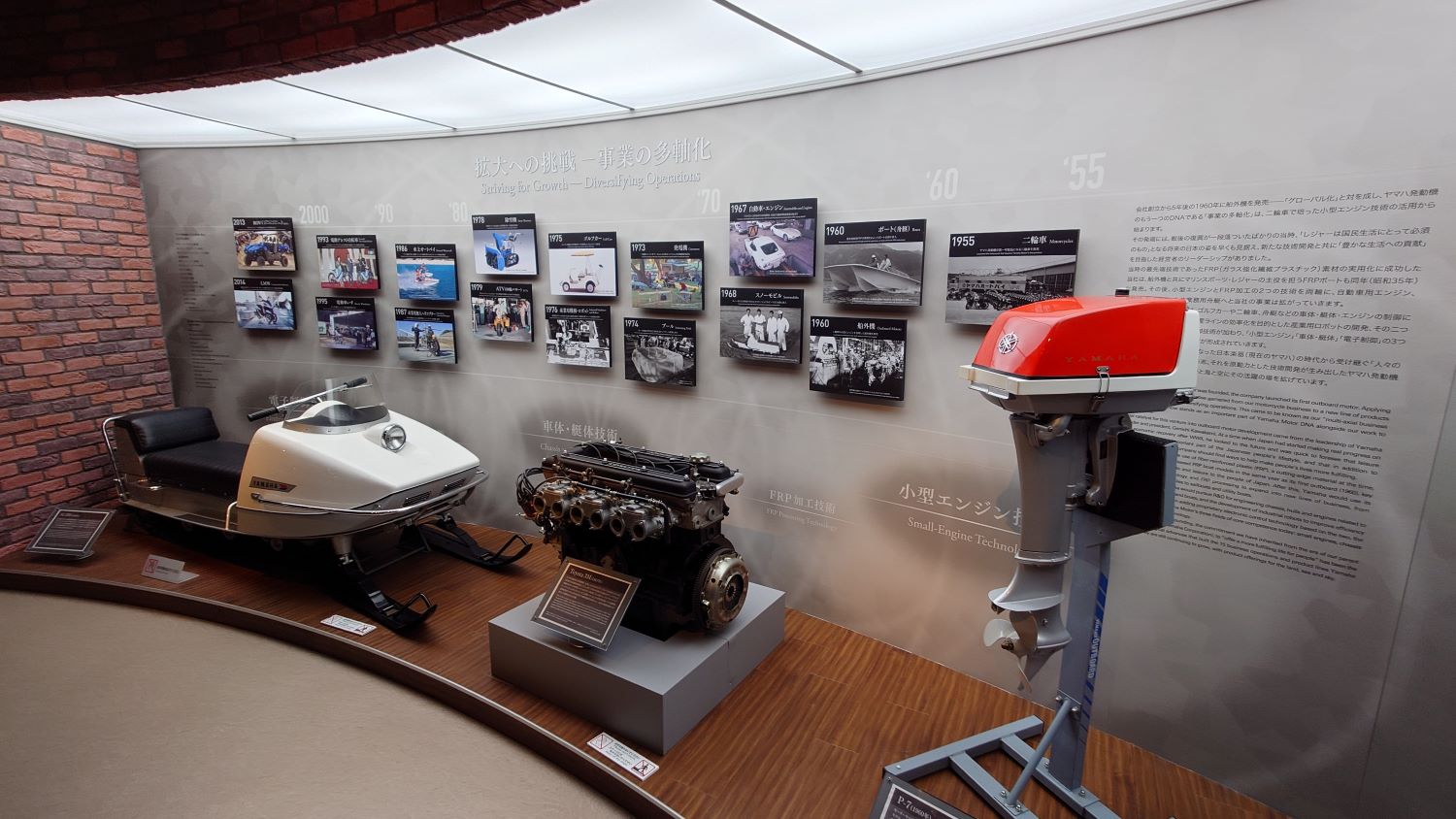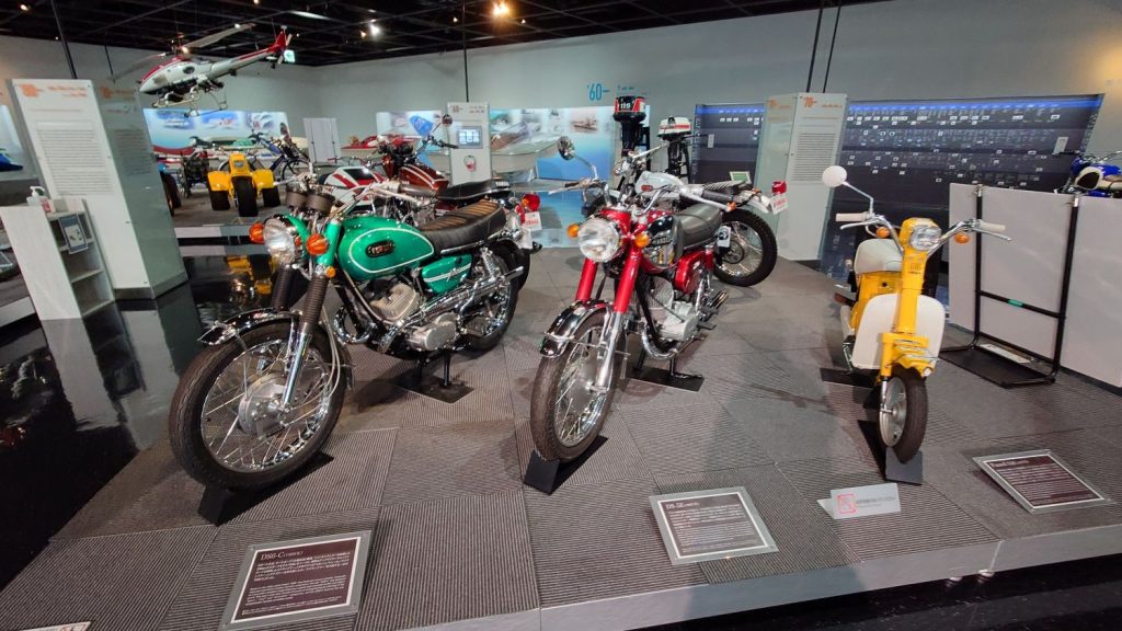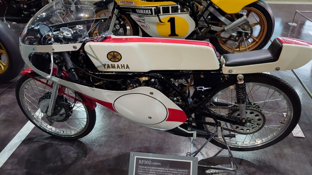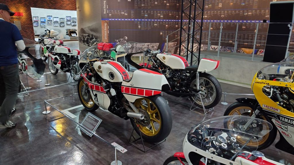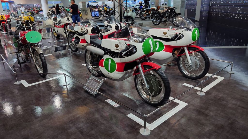 引き続き、ヤマハ発動機コミュニケーションプラザをご紹介します。2階フロアに移動しました!2階ではヤマハの歴史が展示されており、昔のレーシングマシンがたくさん展示されていました。ヤマハはバイクだけでなく、ボートやスノーモービルなど、さまざまな分野に進出しているメーカーなので、とても楽しめます。
