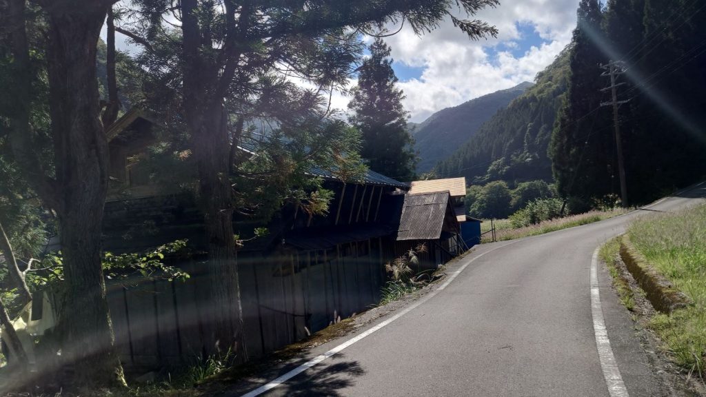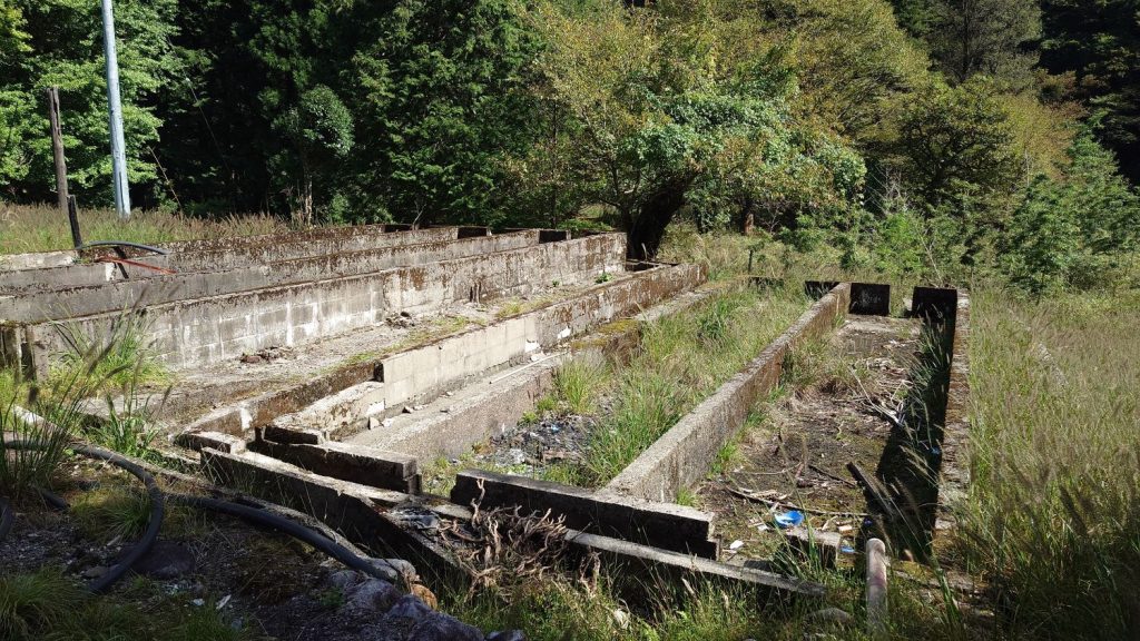 さらに集落内を散策してみると、コンクリート製の生簀(いけす)のようなものも見つかりました。かつてはここで川魚を養殖していたのかもしれません。集落は無人になっていますが、意外にも車の通行が多く、生活道路として現在も活用されているようです。また、バイクの通行も頻繁で、私と同じように有名な「酷道」を走ること自体を楽しむ人たちが多いのかもしれません。