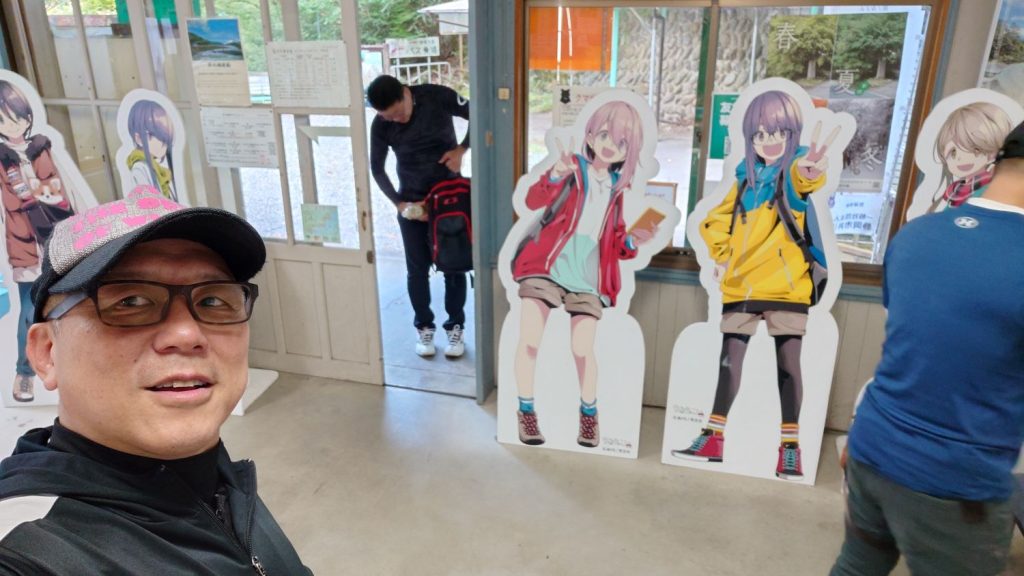 駅舎に入ると、「ゆるキャン△」の等身大キャラクターが出迎えてくれます。この辺りは「ゆるキャン△」の聖地として知られており、至るところにキャラクターが登場しています(o^ ^o)。