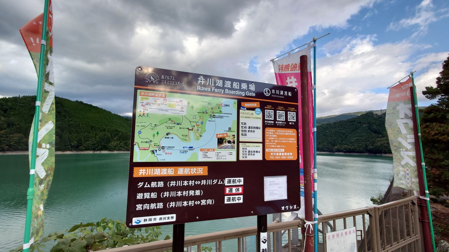 井川湖では遊覧船も運行しており、なんと無料で利用できるそうです。ただ、私が訪れたときは時間が遅くて乗れませんでした……(ノД`)・゜・。とても残念でしたが、次回は早めに行って、ぜひ遊覧船に乗りたいと思います!