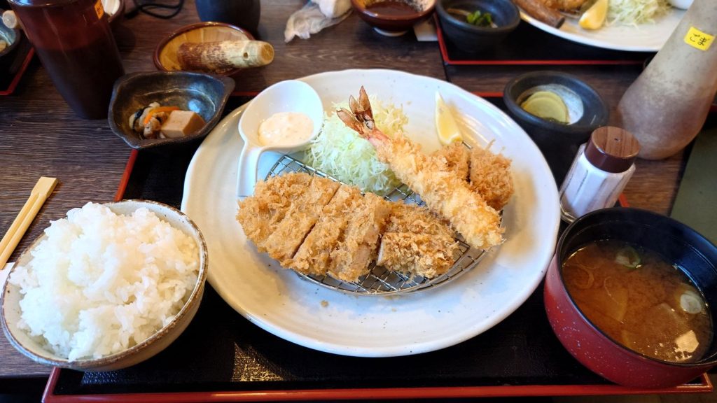 今回は「ランチのロースと海老フライ定食」(3,500円)を注文してみました。
